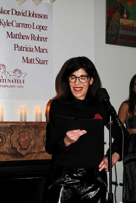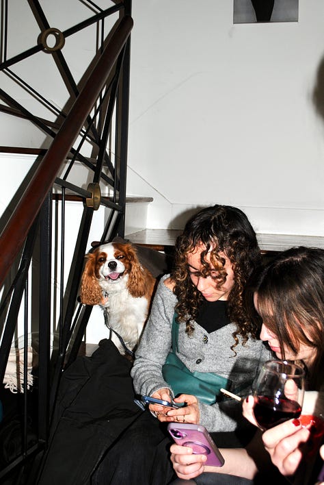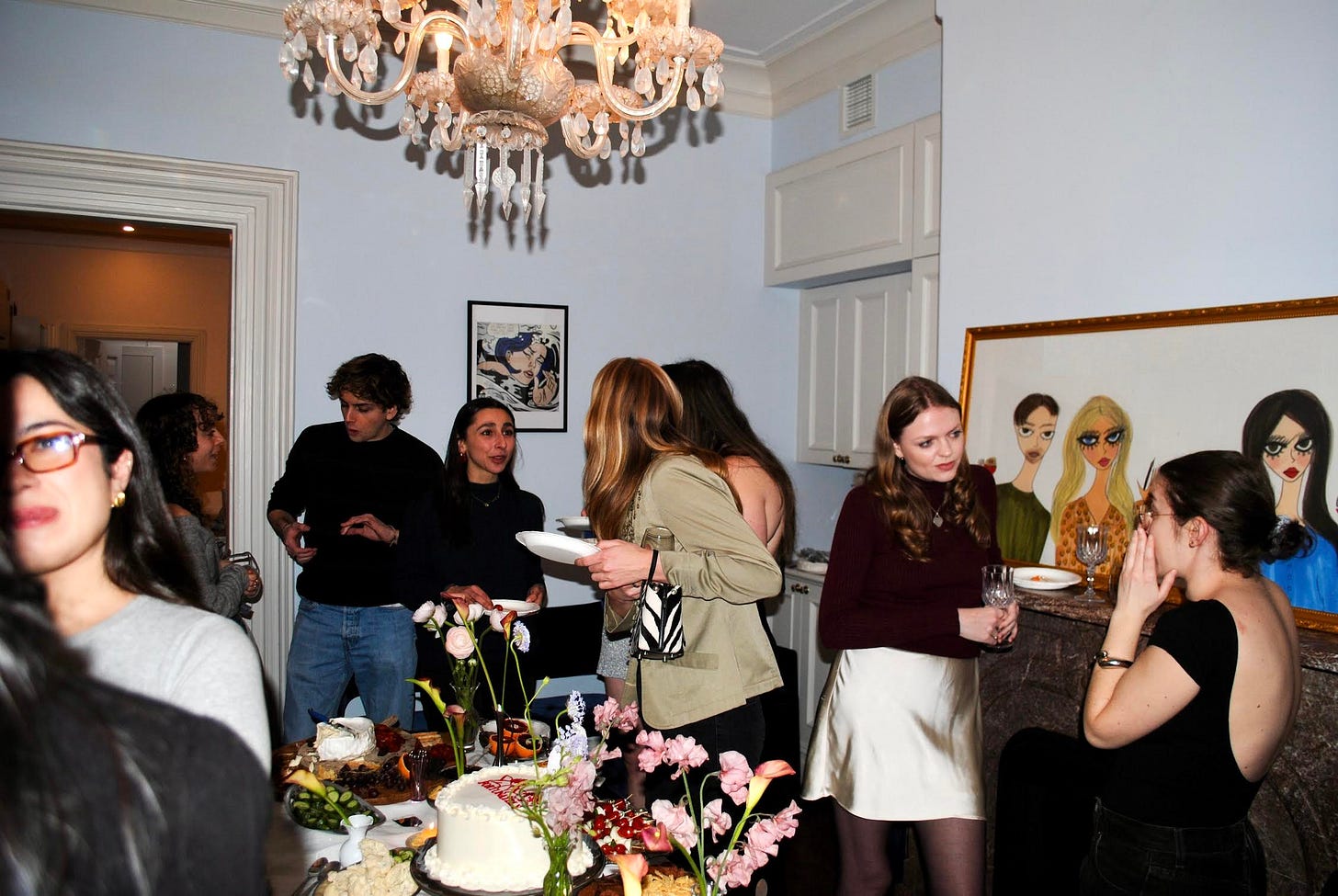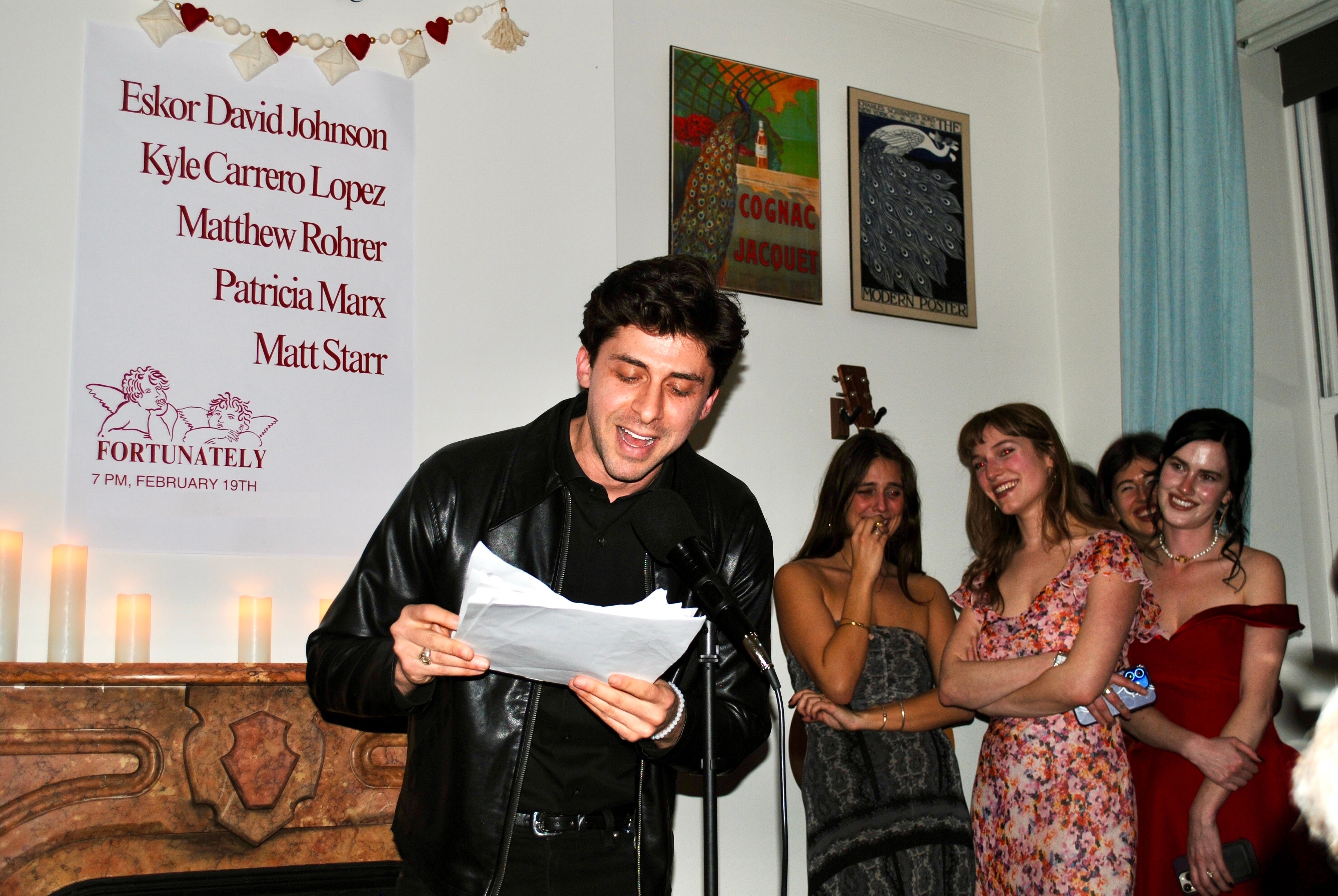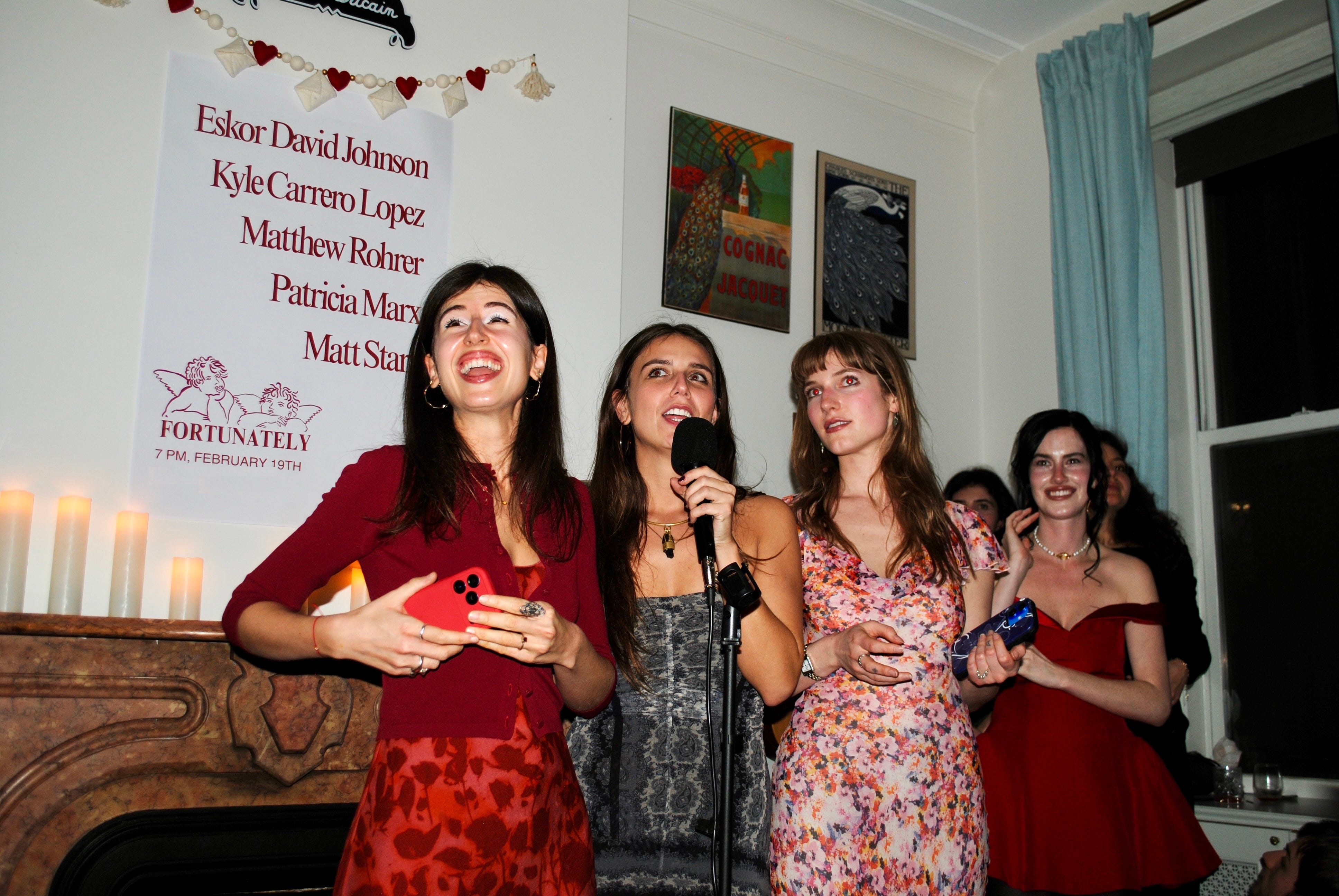 According to Juliette, who sails through the many rooms of the apartment in a flowered dress she stole from her mother, the ladies of Fortunately hand-pick who they invite, intent on creating a “who’s-who kind of vibe.” This becomes immediately apparent as soon as the clock strikes seven: the first people in the door are the current Creative Director and Senior Fiction Editor at Guernica. (“I’m so glad to see so many people turn up to hear writers read,” William Pei Shih tells me, scanning the crowd as it becomes steadily thicker and better dressed.) The second person I speak to is Matt Starr, that Substack dude who hosts readings in unlikely places like S’barro’s and Burger King. From then on, all night long, people are asking me my last name.