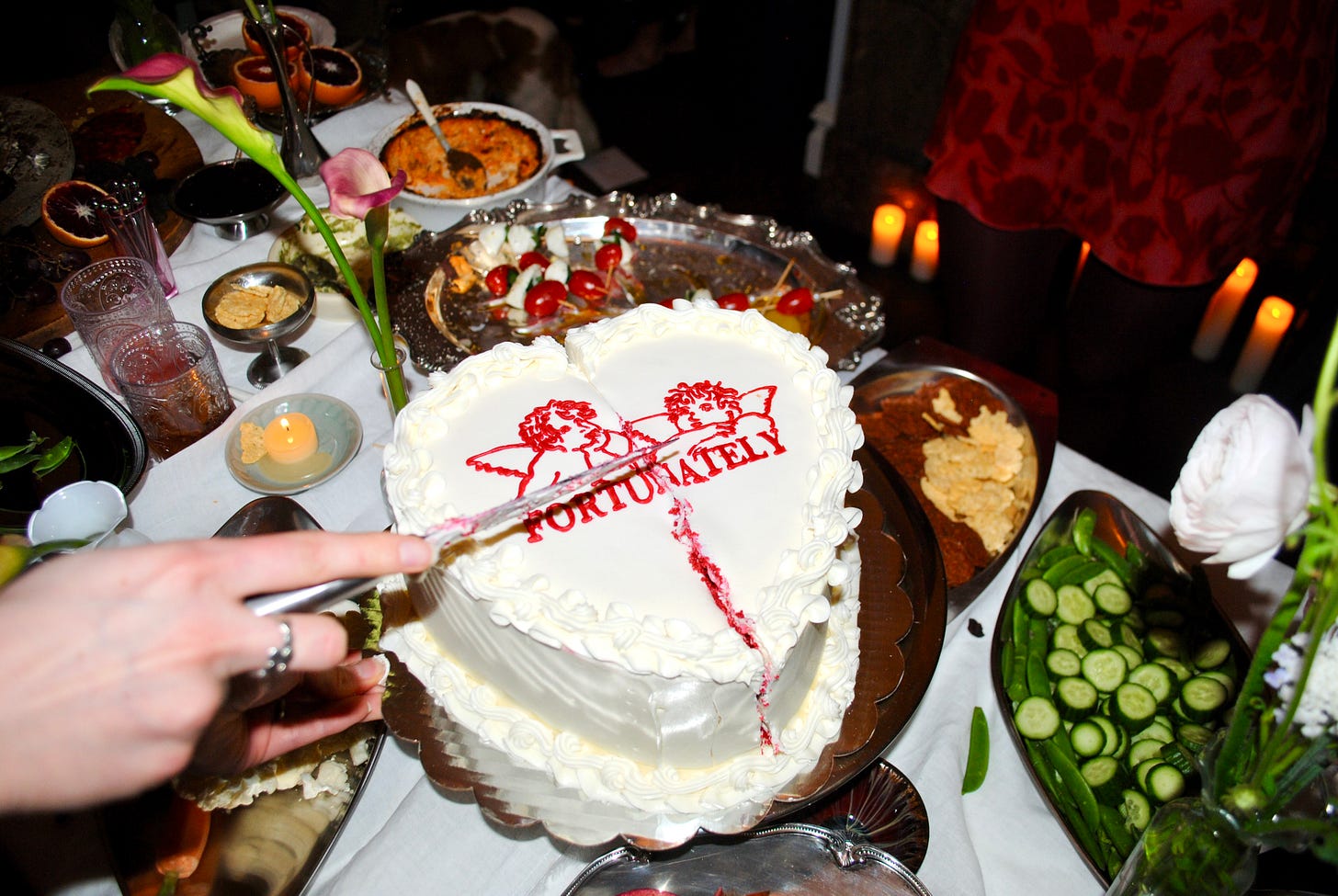 The day of the reading, I slink into the vestibule of an apartment just off Gramercy Park fifteen minutes early and am greeted by four stunning young women flitting around in resplendent cocktail gowns. In the antechamber across from the door, a bartender arranges dozens of miniature glasses and straightens custom-printed menus. In the nearby dining room, a “tablescape expert” decides not to scatter figs on an elaborate gluten-free spread replete with halved pomegranates, branded matchboxes, and a heart-shaped cake.