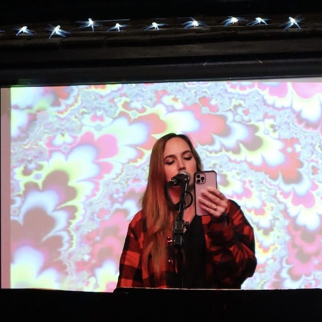 LA-based writer and musician Jessamyn Violet made the first of a notable pair of appearances. Halfway through the set, Chicago institution Nick Rossi performed a poem that I had previously published in a handmade birthday zine. (I didn’t know it until after the performance, but it was his first time reading the poem—about history—in front of a live audience.)