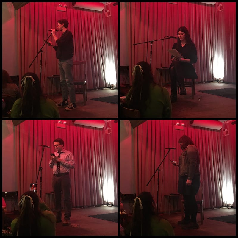 One, called Test, started at 6:30pm and featured three readers (Adam Kaz, Ruby Ann, and Nora Blake). The other, called Comportment, started at 8:30pm and featured four readers (Kelly Hoffer, Elise Houcek, Sara Wainscott, and Stephen Williams). Younger me might’ve attempted to attend both. A double feature. A three mile triangle from my apartment to one venue, to another, and back home before 11:00pm. But, alas, I only chose one. The earlier option. I blame my day job. I blame my knees. Did I mention it was a Wednesday?