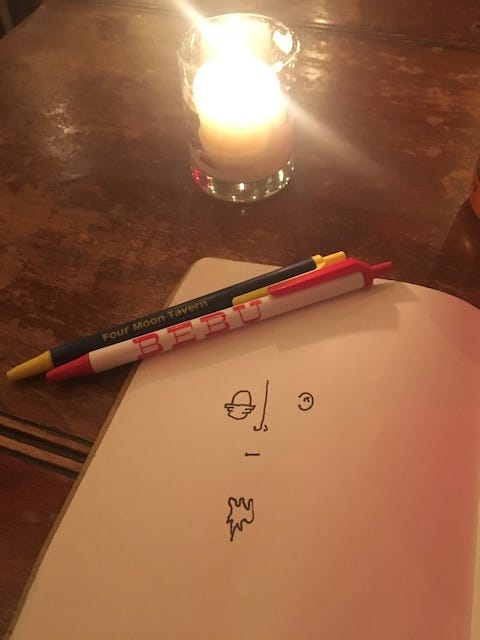Throughout the evening, there were murmurs of tarot and whispers of kimchi. I went up to the bar. Three brave souls ordered three shots of Malört. God bless ‘em. The beers had warmed me up. At one point, perhaps to express the lack of pretentiousness in the room, I wrote in my notepad, “No one here has a pen with a feather.”