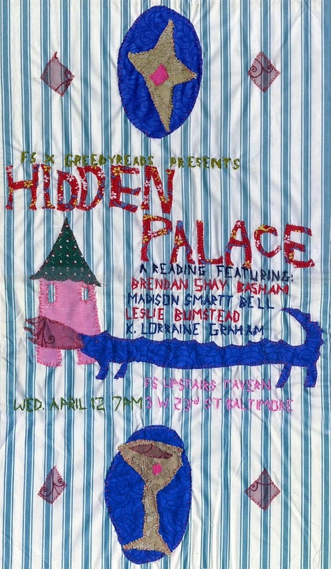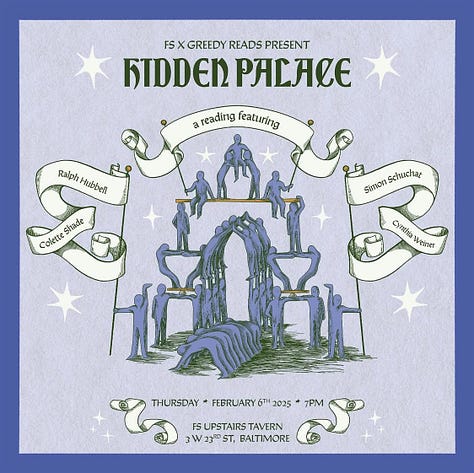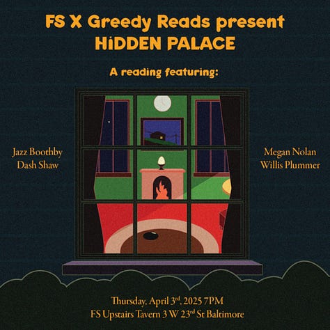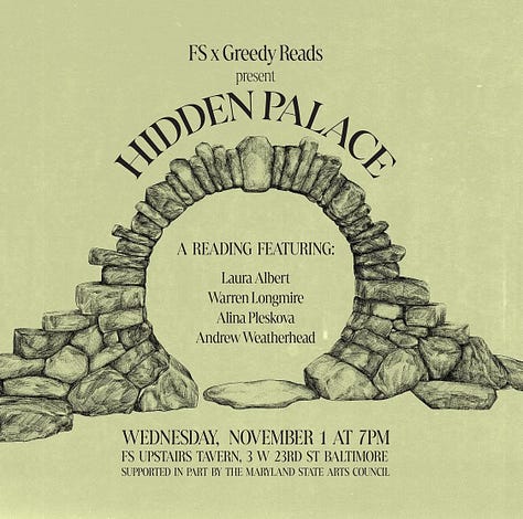 Hidden Palace will forever be one of the greatest reading series of all time. Anyone who has ever read there or attended knows this. The local Baltimore audience is enthusiastic and generous, the venue (Fadensonnen) is beautiful, the books are sold and championed by the amazing bookstore Greedy Reads, and its hosts, Ashleigh Bryant Philips and Joseph Grantham, have both impeccable taste and a gift for cultivating events with real connection and warmth.