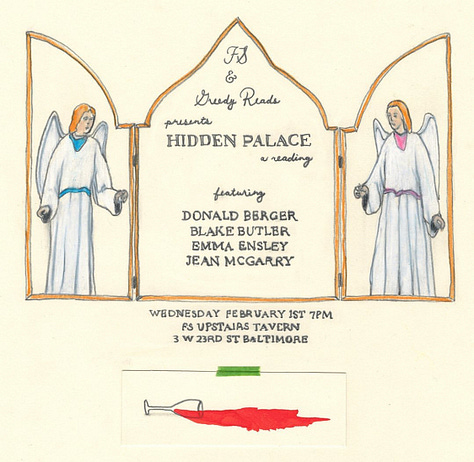 Joseph Grantham: Yeah, I told Ashleigh not to start a reading series. I just imagined her being hounded by writers she wasn’t interested in, or feeling obligated to invite people to read whose work she didn’t care for. And the hounding did happen for the first year and a half or so, but it eventually tapered off. But yeah, I had almost nothing to do with the series for the first few months, aside from suggesting a reader or two. Then Ashleigh took a teaching gig at Appalachian State and while she was out of town I decided to keep it going as long as I could, basically for as long as it wasn’t boring to me. I kept saying, “I think I’m gonna stop after this month,” but then some writer or translator whose work I loved would agree to come read in Baltimore. A funny thing about the name Hidden Palace. Ashleigh told me a while ago that it came from Eliot Weinberger’s book Angels and Saints (a book they used to keep on the tasting table in Angels Ate Lemons). I told the translator Esther Allen that the name came from that book and it turns out she’s good friends with Weinberger and let him know that there was a reading series that took its name from his writing. Weinberger wrote her back saying that nowhere in Angels and Saints does the phrase ‘Hidden Palace’ appear. Ashleigh shrugged when I told her that and said, “Well, it was inspired by the book.”