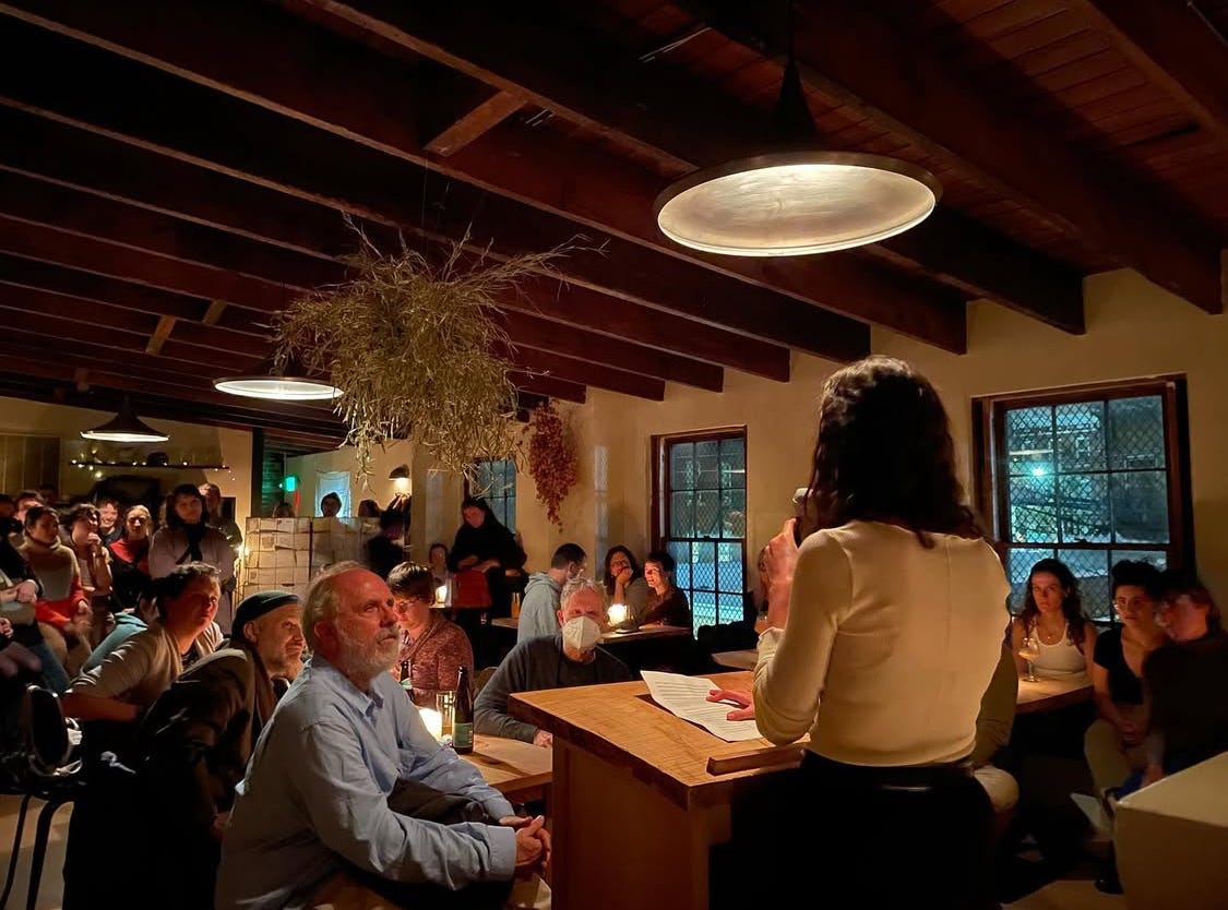 Ashleigh Bryant Phillips: When me and Joey moved to Baltimore, I became a dishwasher at Fadensonnen. Then during the pandemic, Fadensonnen’s founder, Lane Harlan, opened up Angels Ate Lemons, a natural wine and sake shop, right next door and she hired me as the manager. Shortly after, I got published in The Paris Review and Lane was so thrilled. That Christmas she bought everyone at Fadensonnen and Angels Ate Lemons copies of my book. After reading my work, Lane encouraged me to start hosting readings in the upstairs tavern of Fadensonnen. I was honored. Fadensonnen’s named after a Paul Celan collection and Angels Ate Lemons is named after an Etel Adnan line so it felt natural to have a reading series in the space. And I’d ran a series in grad school, so I knew how to do it. But we were still kinda new to Baltimore so I had no idea if anybody would come out. Joey wasn’t gung-ho about the idea either. But after the first couple of installments, we knew we had something going on.