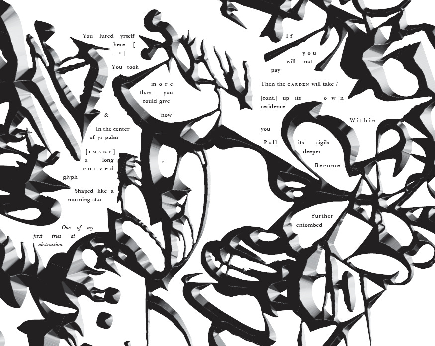 JDF: The garden carries multiple symbolic significance of capitalistic assimilation: a plot of land in which mankind performs its violence—mows, prunes, tills, sows its own diabolical seeds—to raise a glorified image of itself (an optical illusion of artificial/unreachable beauty), and a psychogeography of blame in the façade of compassion where “the contours of the veil” outline less a recognition than a belonging in “the throes [ ! ] / [cont.] of the self-immolation rodeo.”