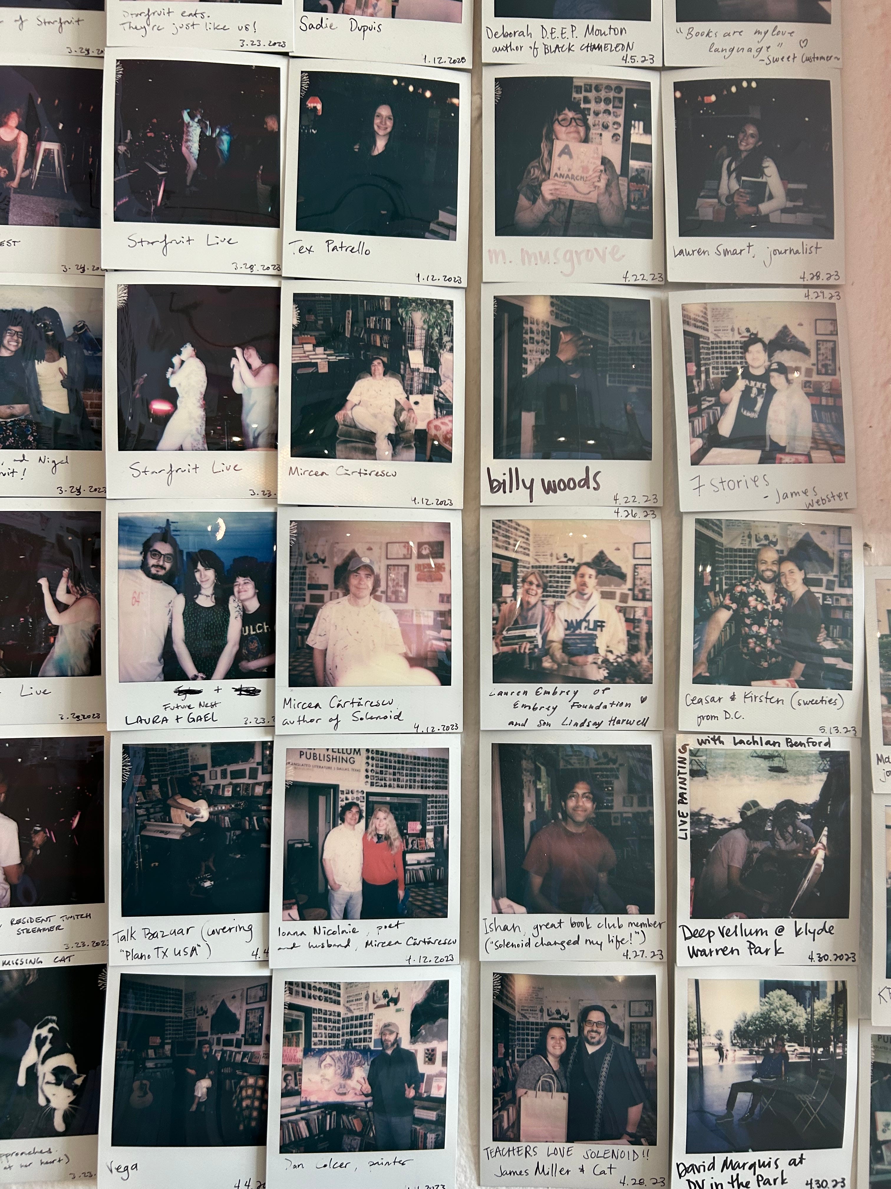 Their storefront sits on the corner of Deep Ellum’s Commerce Street. On the day of my interview with Riley, my friend and I park a block away, twenty minutes early. To kill time, we rifle an arrangement of books on the table labeled “Women in Translation month.” Four staff members sit in the corner of the store, cataloging a stack of damaged books. Soon I’ll learn the employee with cropped brown hair and dangly earrings is Riley, but in the moment she’s a happy stranger typing on a laptop, intermittently pausing to drop lore about particular poets and magazines, then characterizing the personas of readership for said poets and magazines. I am introduced to Riley when she sees me examining an Edouard Levé book, asks if I have any questions. I say I have many, since I’m here to interview her! She gives introductions to the booksellers, begins a tour of the shop that momentarily pauses when we reach the wall of polaroids with shots of book club members, billy woods, Mircea Cărtărescu, and other patrons. Riley notices a customer holding a copy of Carson McCullers’ The Heart is a Lonely Hunter. Her eyes glimmer and she informs the woman it’s her favorite book. I’m positive the customer can’t help but be tempted to read it after witnessing the conviction in Riley’s smile.