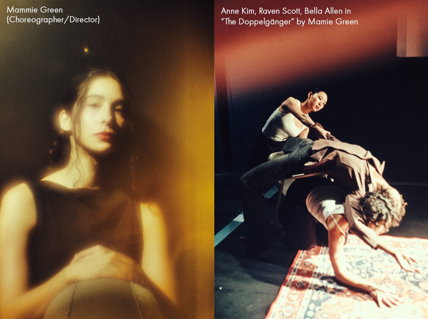 In a black box theater, with minimal and “mundane” props (as Mamie has explained to me), three vignettes are performed, two accompanied by narrative-like poems. The first, “Doppelgänger,” utilizes a powerful text co-authored by Sammy Loren and Stephanie Wambugu, which blends poetic elegy with the tone of 1950s hard-boiled gumshoe narration. We hear of a woman who finds in film not only escape but recognition as well. “Movies can know us, yes. They can see us. When we watch them, they watch us back,” she confesses to us. And we see two dancers “embody her inner landscape” (again quoting Mamie). Often twinning each other, they physicalize the narrator’s emotions and show us her release into her world. Mamie has managed to depict how being alone with cinema can unleash another life, one tangible enough to ripple out long after the film has ended: