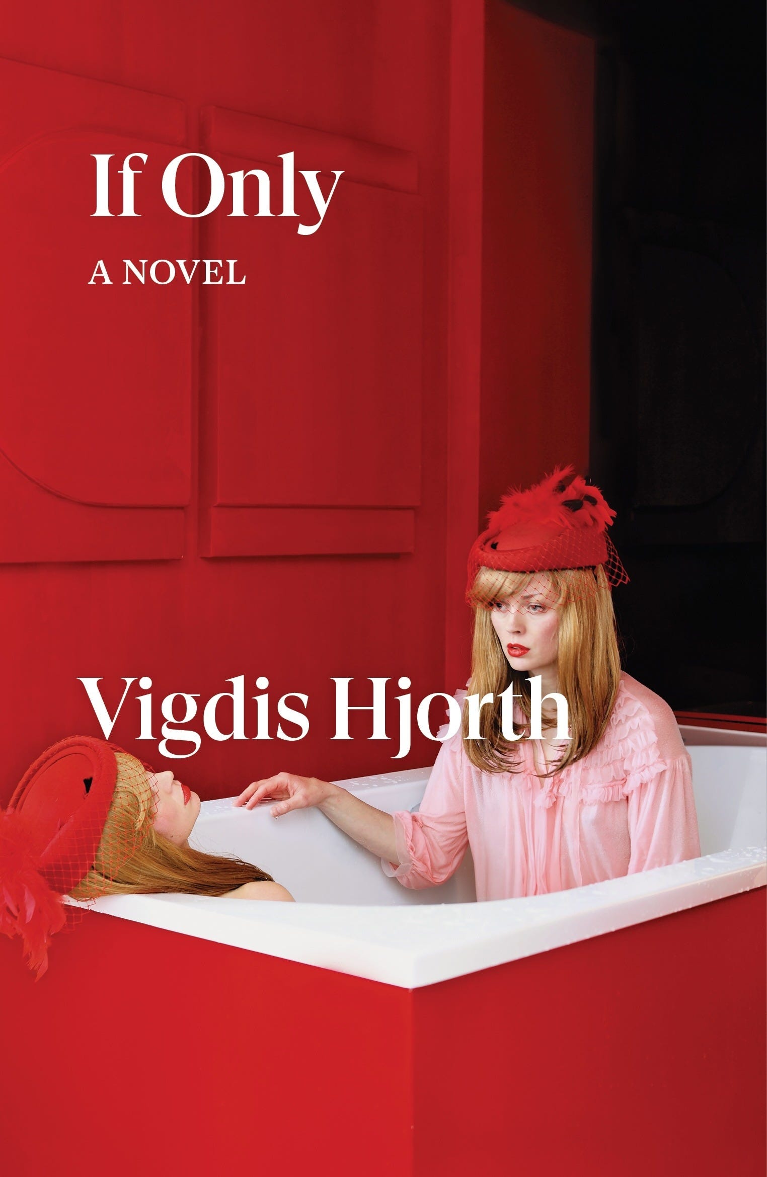 I picked up Vigdis Hjorth's If Only because of the cover. It's a striking red photograph by the Norwegian artist Anja Niemi, and I was drawn to how unnatural it looks, the glamorous woman staring at a copy of herself in the bathtub. It's called "The Socialite." I liked the idea of this book on my nightstand, in my bag, the uniform red color throughout the front and back felt soothing in its staged strangeness.